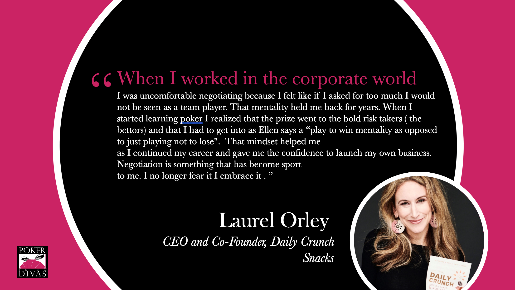 Ellen saw first hand how poker made herself and her clients better negotiators and created the B.O.L.D System to help more women discover how to negotiate and win.